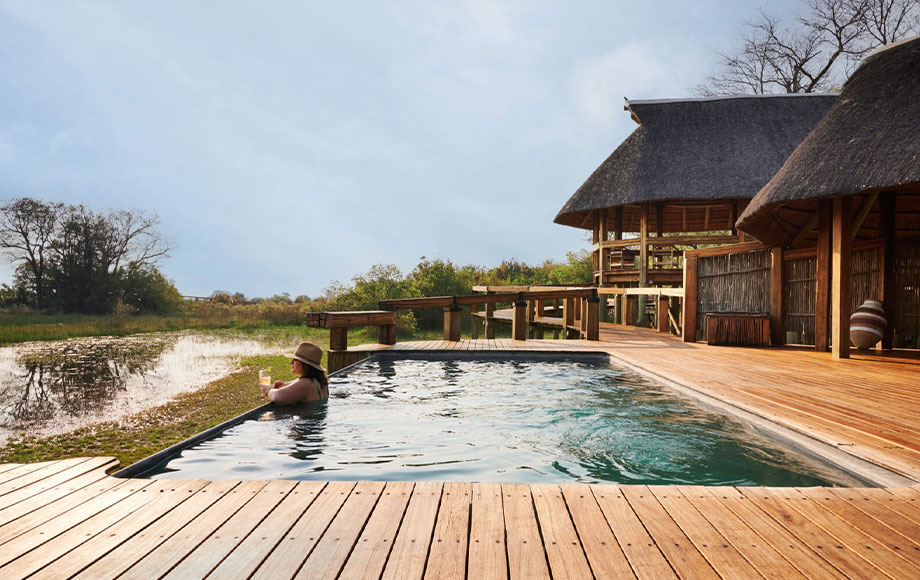 Shaded by tall ebony trees, the shared central area comprises several comfortable lounge areas, a library, cocktail bar and dining area with a thatched ‘boma’ where breakfast, brunch and dinners are enjoyed. Afternoon tea is served on the open-air deck facing the floodplains. There is also a swimming pool flanked by sunlounges, with a small massage area to one side.