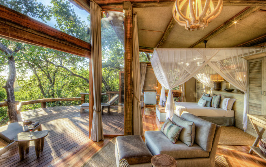 - Central main camp with sunken bar built around an ebony tree, lounge area, library and elevated dining area.