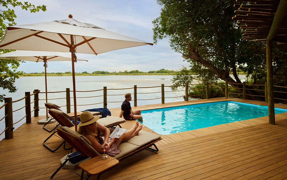 Located on a magical lagoon within a private concession, Xugana Island Lodge takes full advantage of its stunning natural surroundings. The dining and lounge areas nestle beneath shade trees, whilst an expansive deck, open-air ‘boma’ and al fresco dining space all overlook the crystal clear permanent waters of this part of the Okavango. Within the grounds is a secluded swimming pool at the centre of Xugana Island.